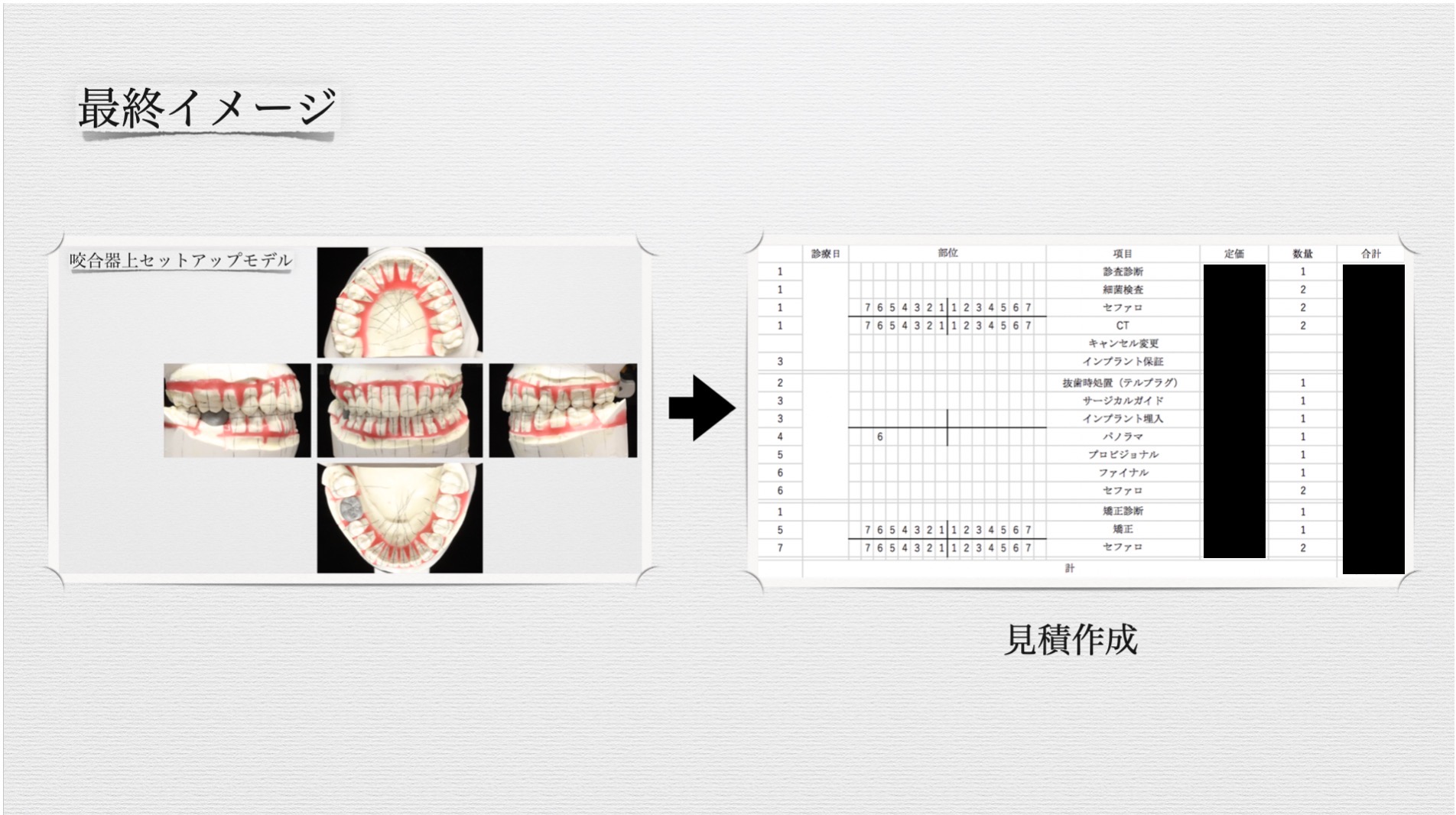 補綴診断では顔面における顎の位置を基準に術前の咬合を元に、機能回復し最終補綴物のイメージをしやすい様にします。歯周疾患は症状なく進行し、歯が植立している歯槽骨を溶かしてしまう疾患です。歯周病を正しく理解し、現在の状況を把握・管理することが自身の歯を永く保つ基本です。健康保険だけでは補うことができない部分がとても重要です。保険でできる部分、できない部分を比較しその現状を踏まえて行います。どんなことを行うか?の一例を紹介します。